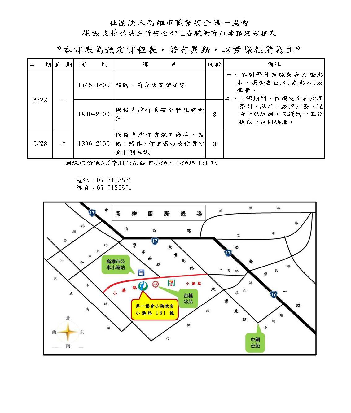 回訓 模板支撐作業主管回訓-小港 夜間 小港 115-06-22 ~ 115-06-23 115-06-19 6 800