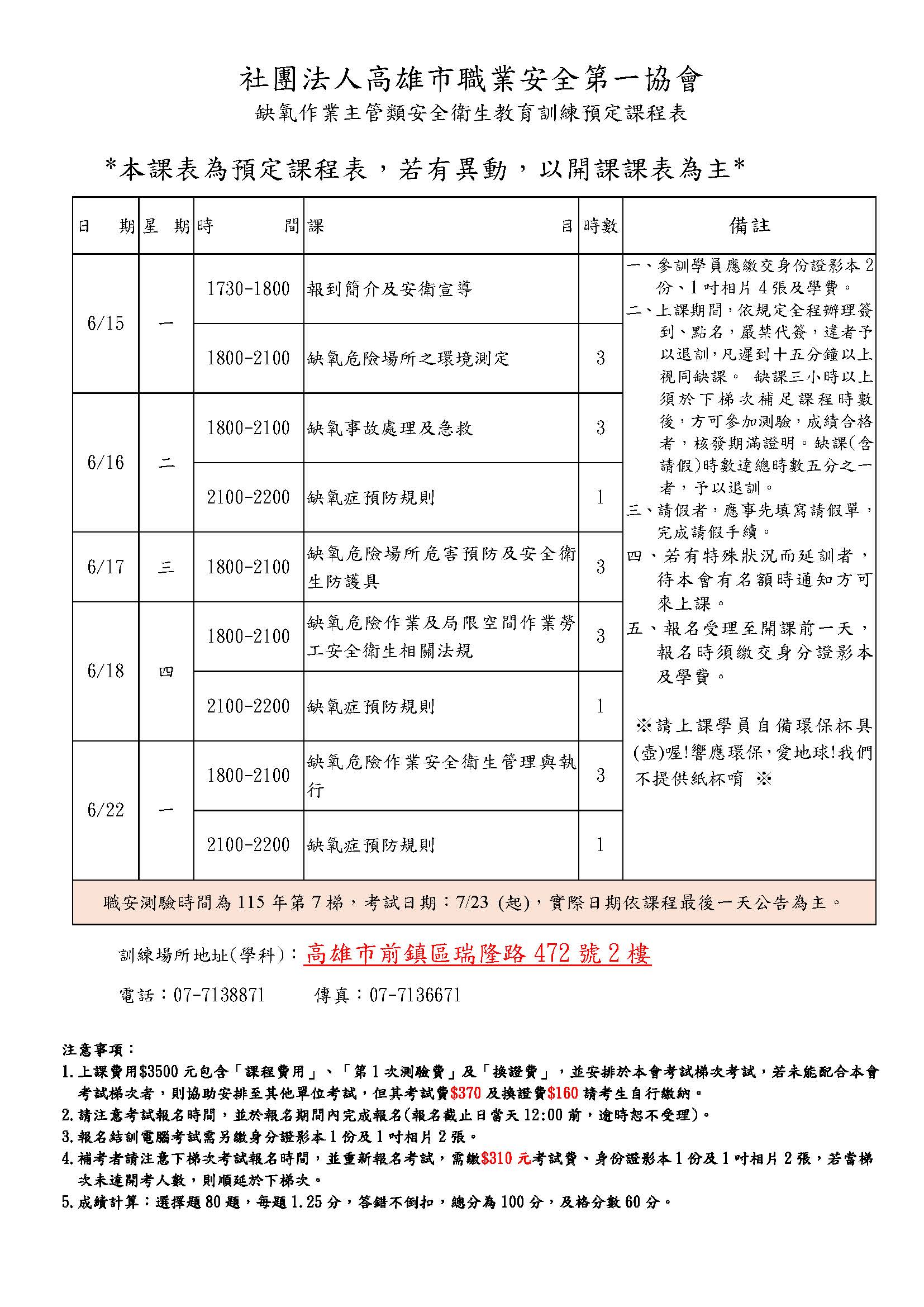 管理類 缺氧作業主管 夜間 瑞隆 115-06-15 ~ 115-06-22 115-06-12 18 3,500