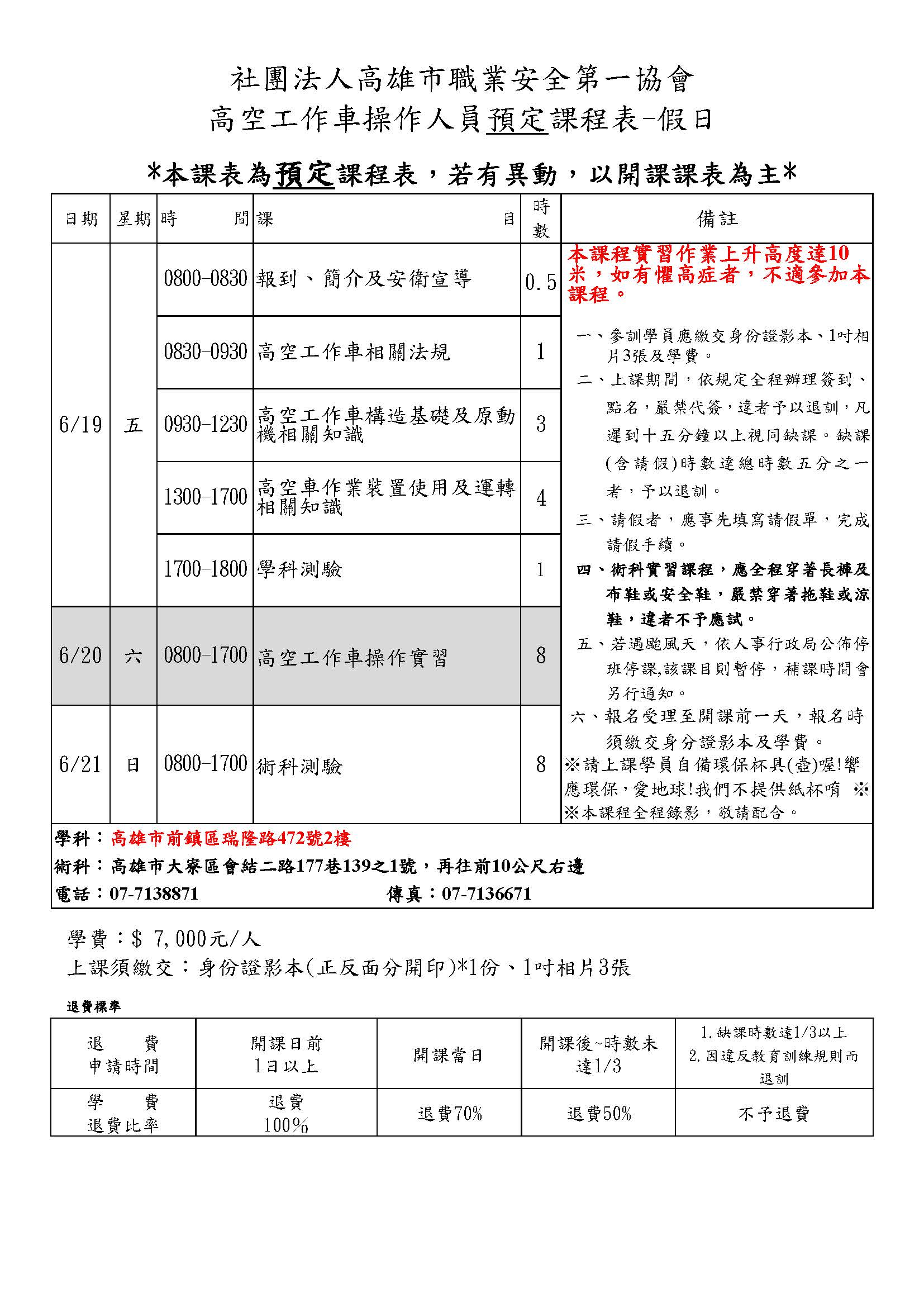 機具類 高空工作車操作人員安全衛生教育訓練 假日 瑞隆 115-06-19 ~ 115-06-21 115-06-14 16 7,000