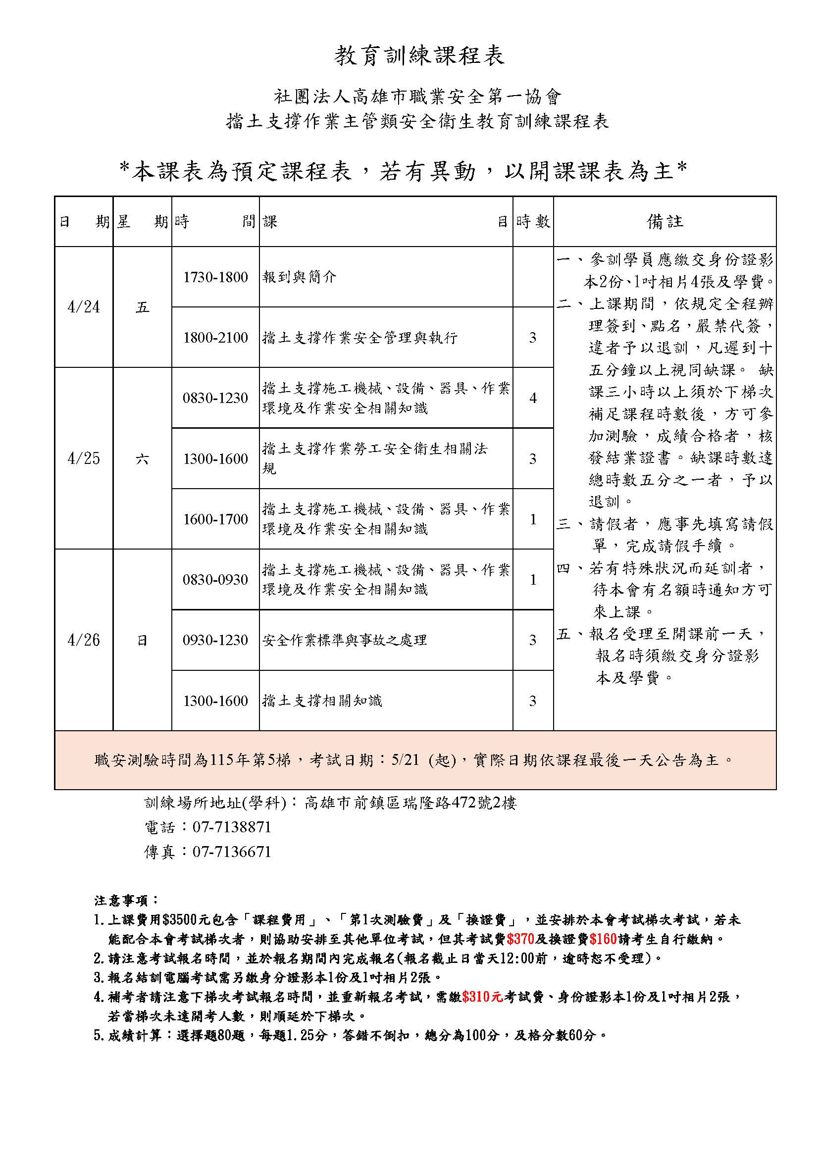 管理類 擋土支撐作業主管 假日 瑞隆 115-04-24 ~ 115-04-26 115-04-20 18 3,500