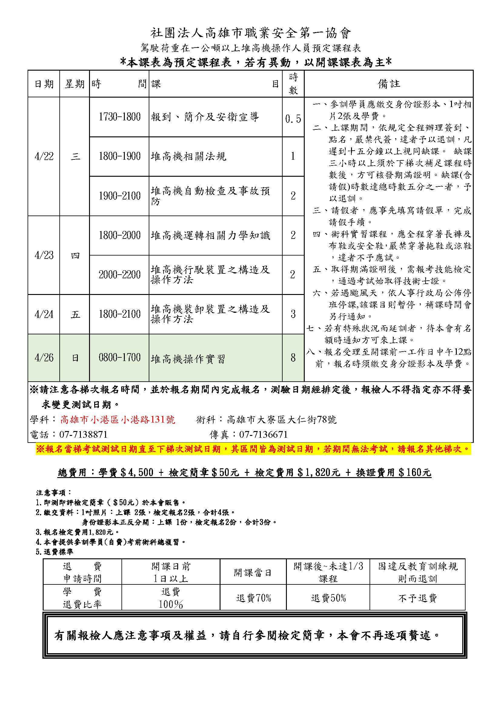 管理類 臺灣職安卡-小港 假日 小港 115-04-26 ~ 115-04-26 115-04-20 6 1,200