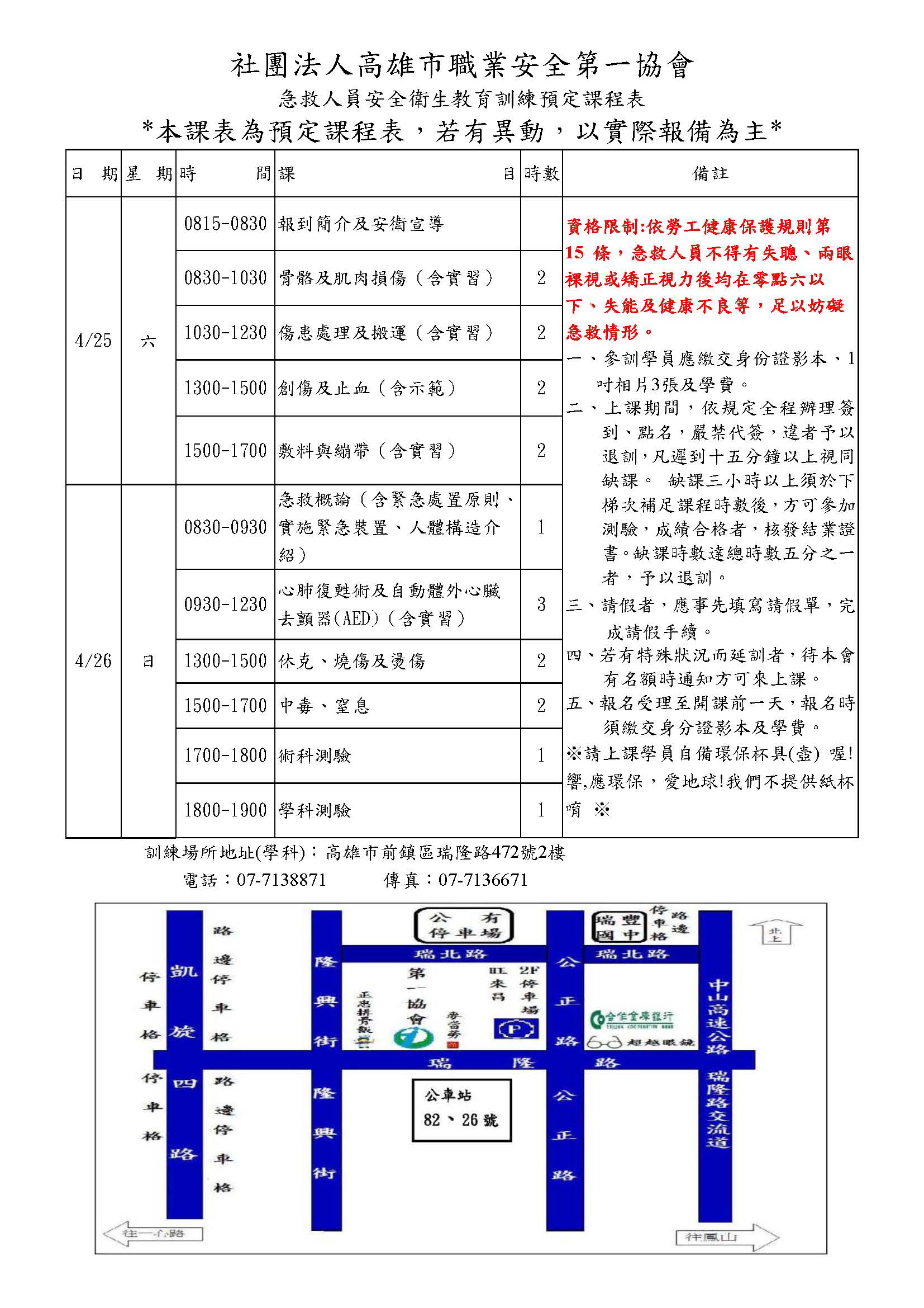 回訓 急救訓練回訓-小港 日間 小港 115-04-24 ~ 115-04-24 115-04-21 3 500
