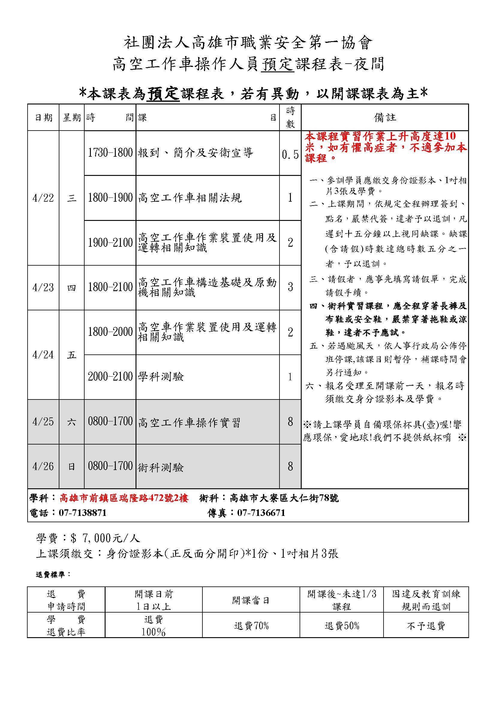 回訓 高空工作車操作人員回訓 夜間 瑞隆 115-04-22 ~ 115-04-22 115-04-19 3 500