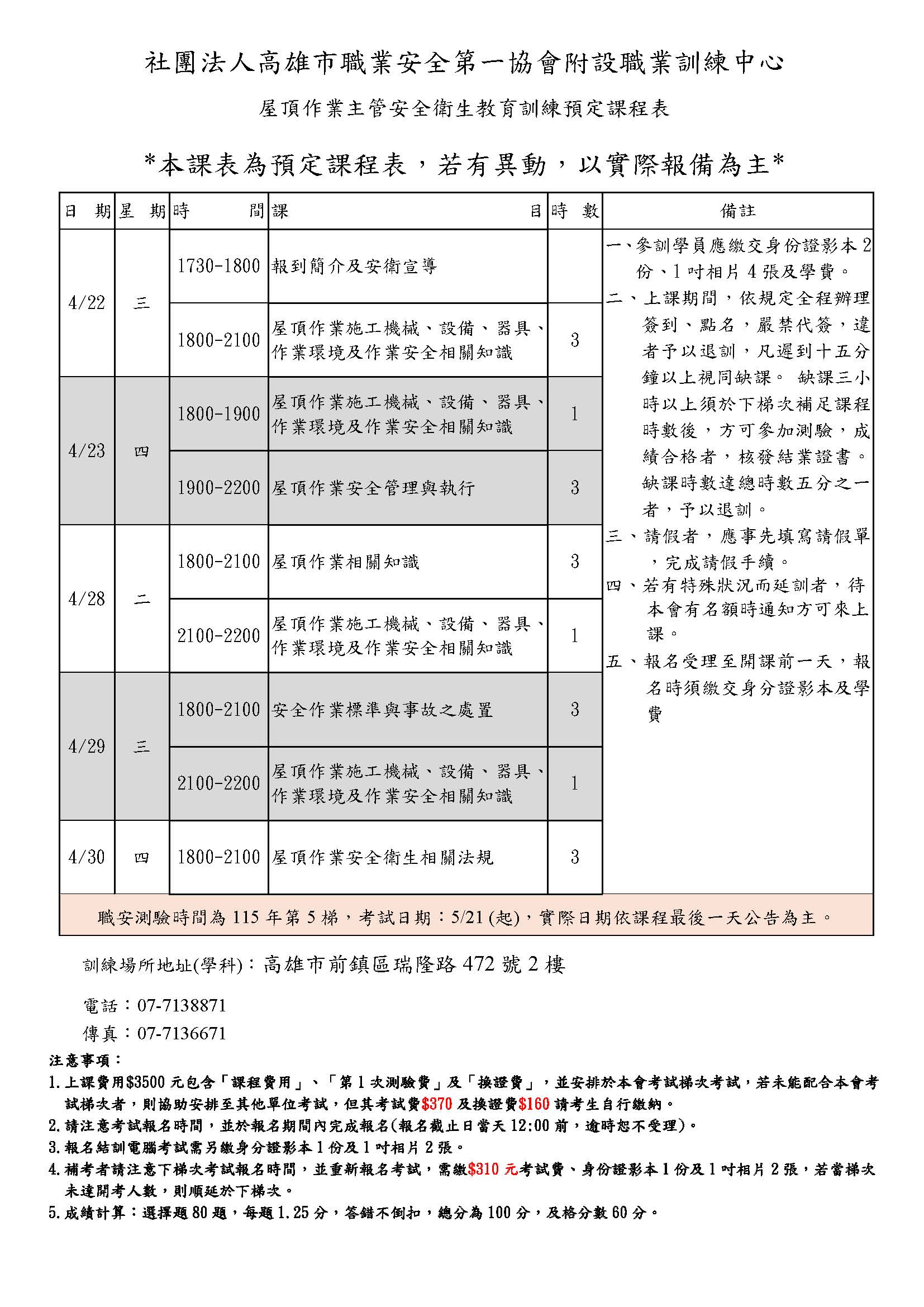 • 開課班別:屋頂作業主管